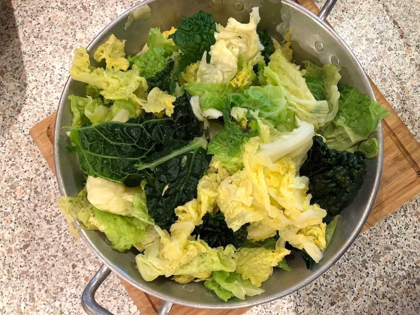 Wirsing in einem großen Topf mit kochendem Wasser (etwas gesalzen oder mit etwas Gemüßebrühepaste) ca. 5-7 Minuten vorkochen. Danach abtropfen und zur Seite stellen.