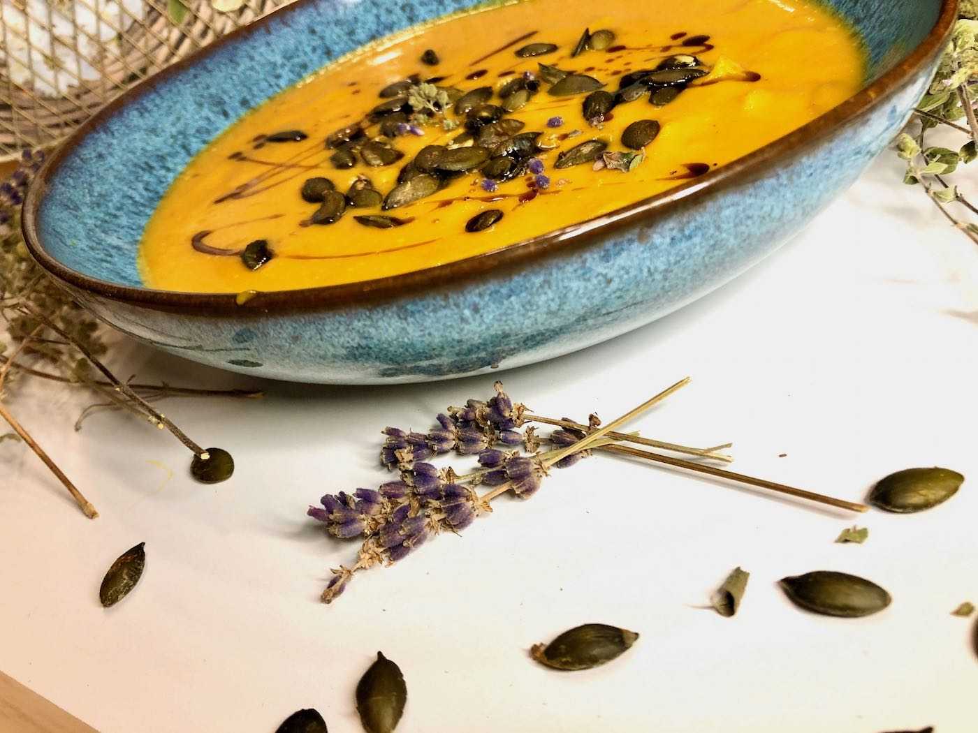 Nun die Suppe auf Tellern anrichten und mit gerösteten Kürbiskernen und Kürbiskernöl dekorieren.