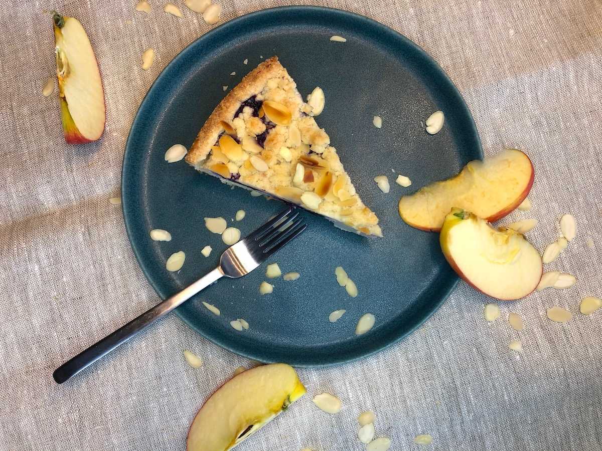 Den übrigen Mürbeteig mit den Mandelblättchen mischen und über den Kuchen streuseln.