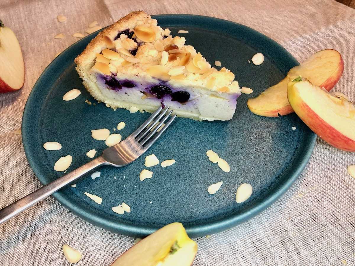 3/4 der Masse auf den Mürbeteig verteilen. Die Apfelscheiben auf die Käsefüllung des Kuchens legen. Die Heidelbeeren mit dem verbleibenden Quark mischen und auf den Äpfeln glatt streichen.
