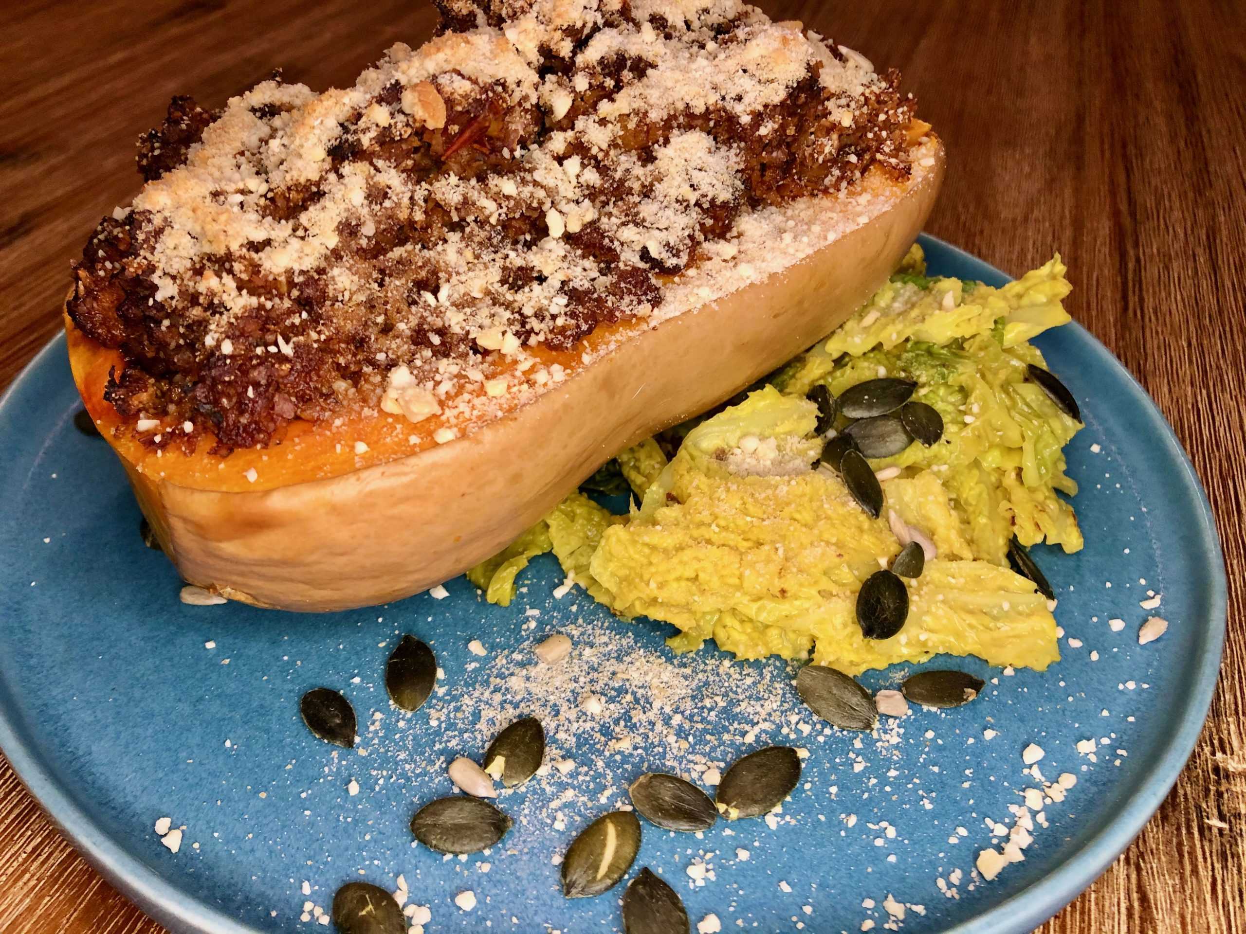 Mit Kürbis kann man ja fast alles anstellen. Hier gibt’s mal eine weit bekannte Variante mit einer herzhaften Füllung aus dem neuen Incredible Hack von Garden Gourmet* und selbstgemachte „Parmesan“ als würziges Topping.