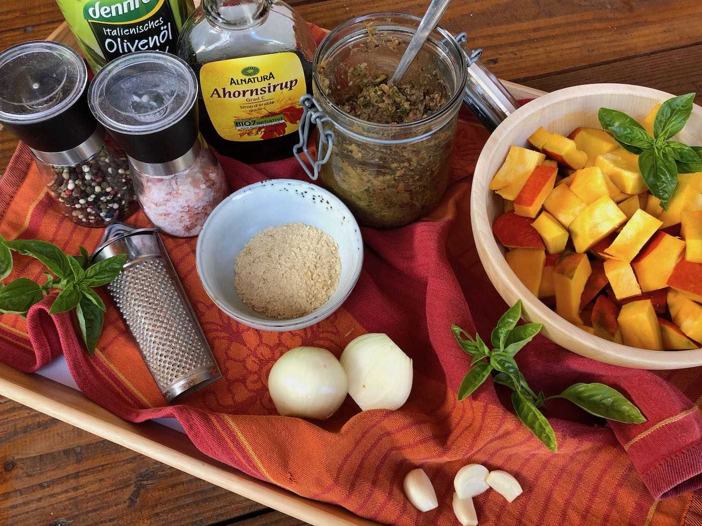 - 1 Hokkaido-Kürbis, in ca 1 cm große Stücke gewürfelt