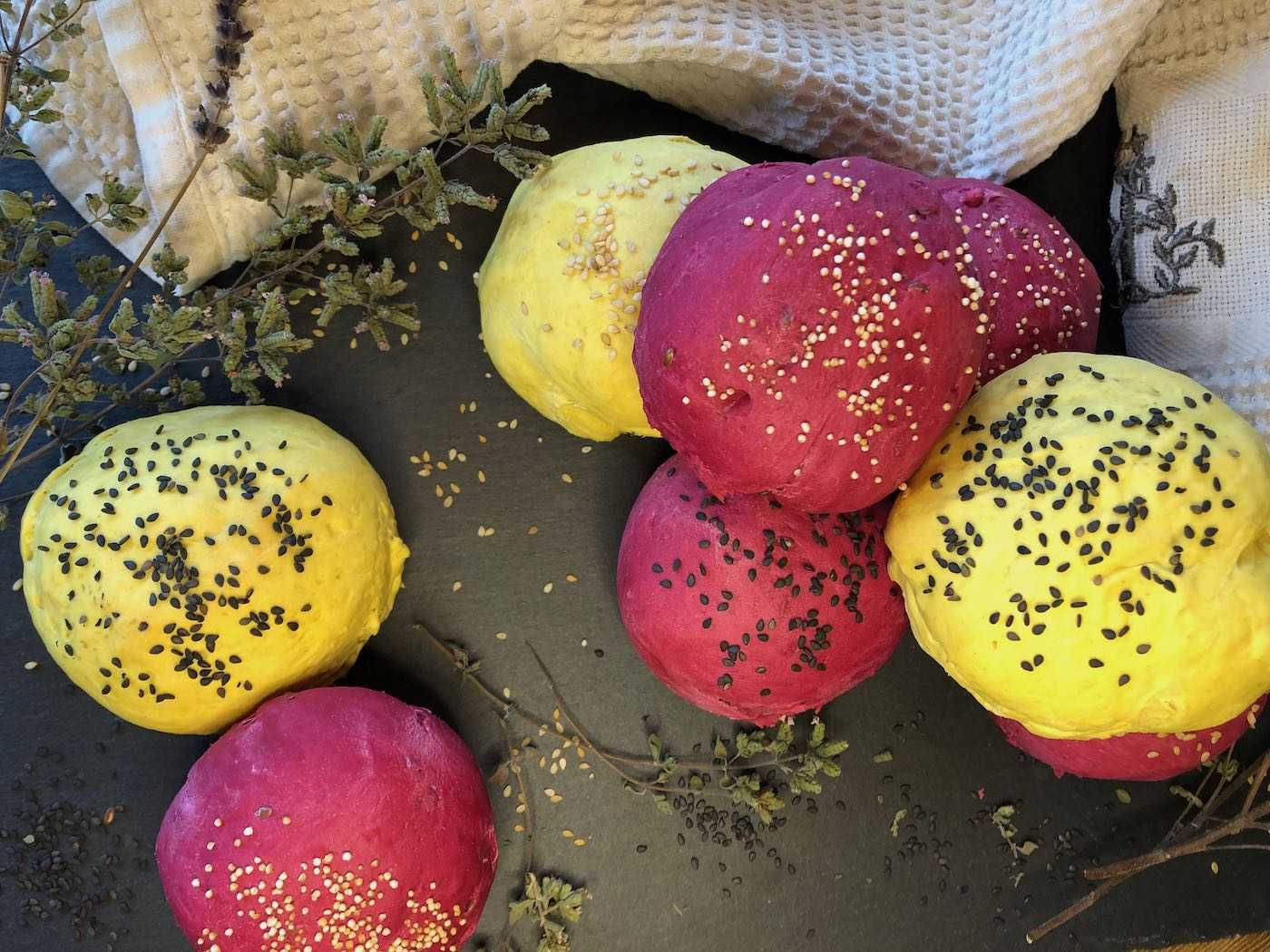 Die quietschbunten Einfärbungen kommen von entsprechend gefärbten Lebensmitteln, die einfach zum Teig dazugegeben werden. Hier haben wir für die rosa Brötchen einfach Rote Beete Saft als Flüssigkeit verwendet. Und für die gelben Brötchen kam ein kleines bisschen Kurkuma zum Einsatz.