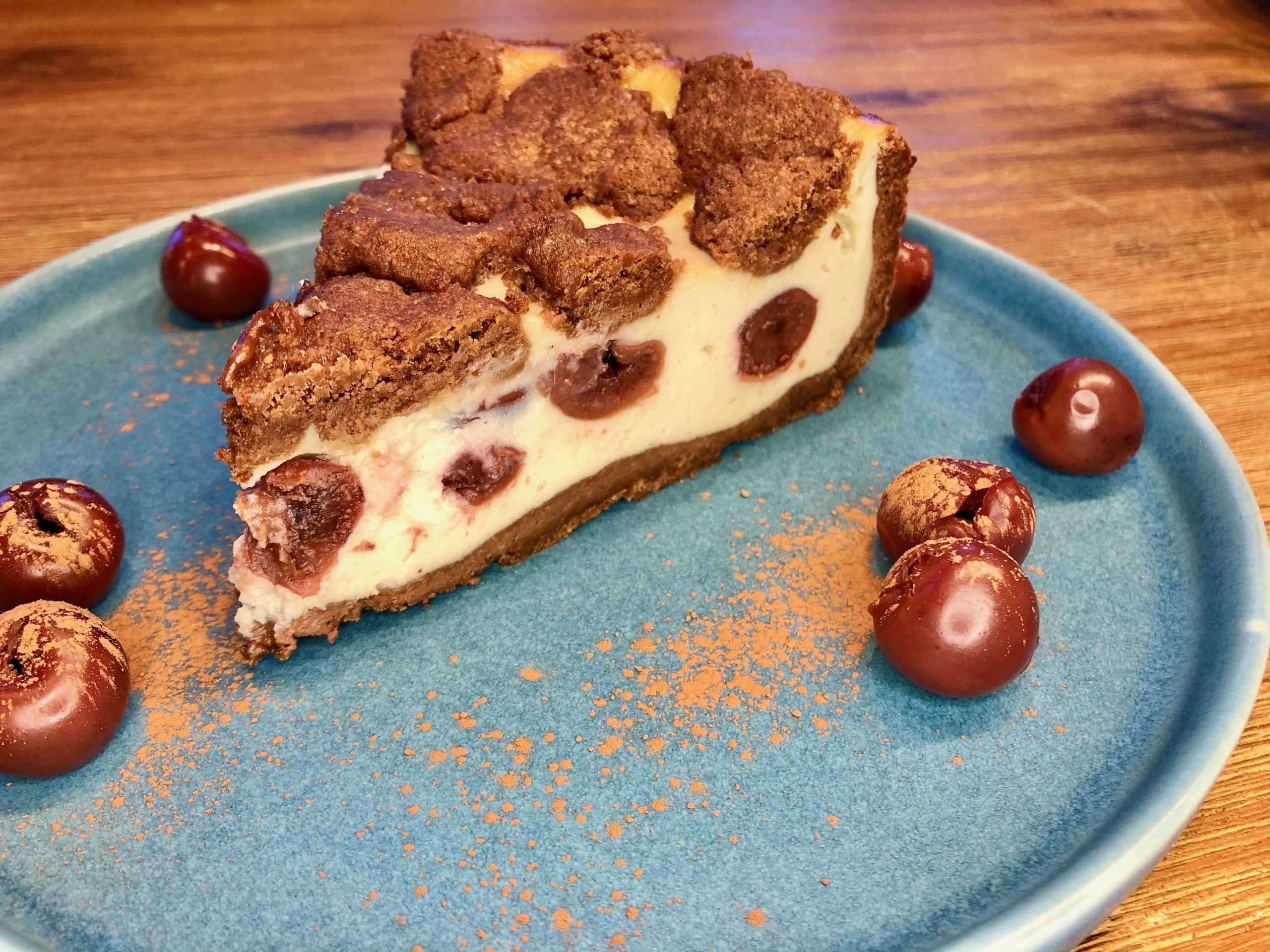 Die Alsan schmelzen und lauwarm mit dem Zucker und dem Puddinpulver verrühren. Den Sojaquark unterheben und die Masse auf dem Kuchenboden verteilen. Die Kirschen darauf verteilen und mit einem Stil leicht in die Quarkmasse drücken
