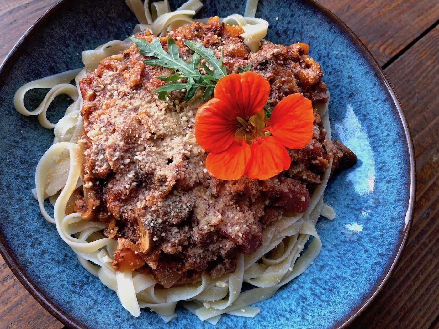 Mindestens 15-20 min köcheln lassen. Wer mehr Zeit hat, einfach bei niedriger Temperatur länger auf dem Herd stehen lassen. Bolognese wird mit der Zeit einfach immer besser 🙂
